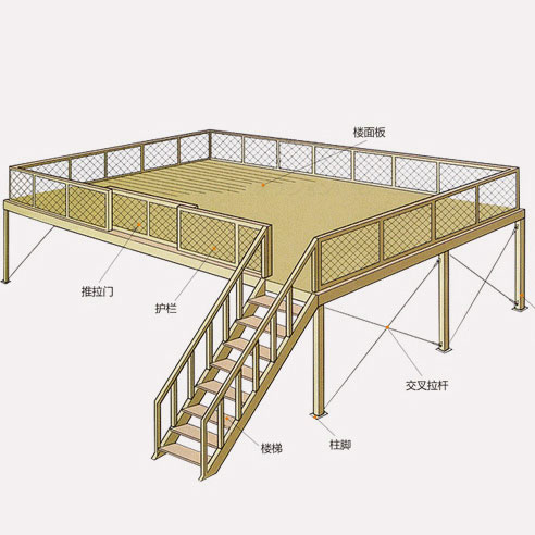 鋼平臺:一樓圓管/方管做立柱支撐,二層為平臺;適用于庫房較高,堆放較密集的情況。(一般為托盤平地碼放)一樓叉車/堆高車存取,二樓人工/搬運車存取的情況。也可設升降平臺。